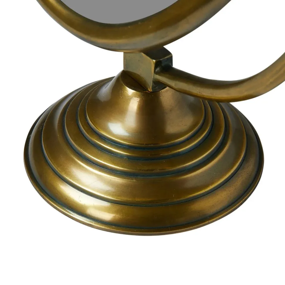 Bring timeless elegance to your vanity or console with this aluminum framed mirror on a stand, finished in a warm antique brass. The oval mirror sits atop a sculptural base with subtle detailing, blending classic design with modern utility. Perfect for a bedroom, bathroom, or entryway vignette, this mirror doubles as both a functional piece and a decorative accent. Its compact size makes it easy to style on dressers, side tables, or shelves, adding character and refinement to any space.