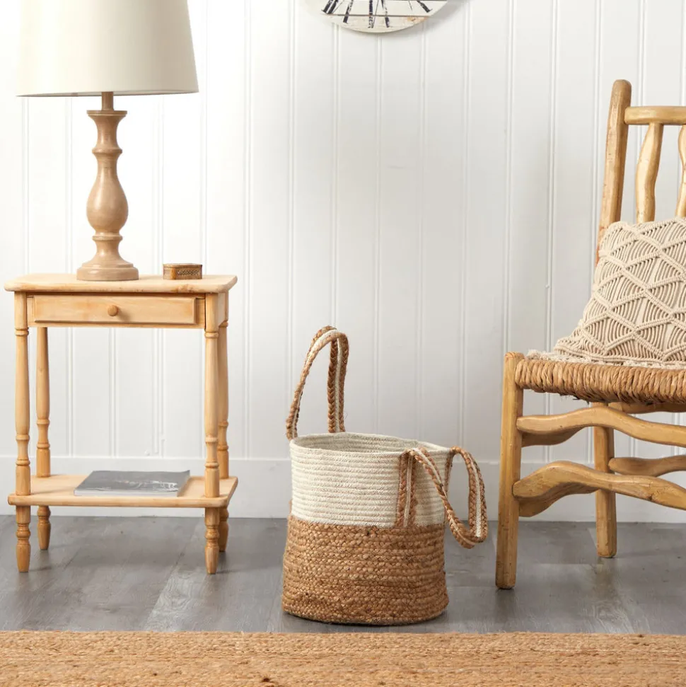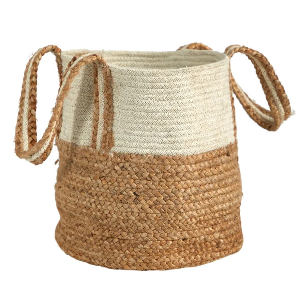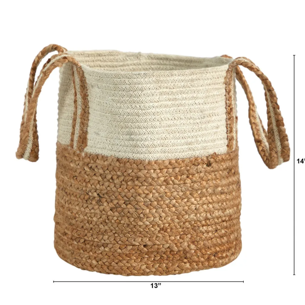 If you’re looking for a cute, trendy accent to house your favorite faux-bulous plant, or a little extra storage, this jute basket is perfect. Handmade by artisans for long lasting use, feel authentic and natural, especially if you enjoy an earthy palette, the darker shade in the bottom, adds a rustic touch. For easy storing, this basket has two handles on each side. Standing 14″, add to any area in need of some texture and color. House pot sizes with a width less than 13″. Has no drainage holes