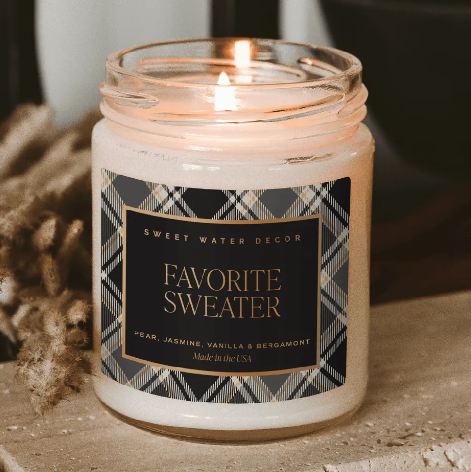 Crisp Autumn air, a favorite knit sweater, and the soft glow of candlelight — set the scene with our Favorite Sweater candle. Cozy notes of pear, vanilla, and bergamot fill your space with effortless warmth, perfect for crisp evenings and quiet mornings. Its grey, black, and gold plaid design adds a timeless, tailored touch to your Fall decor.