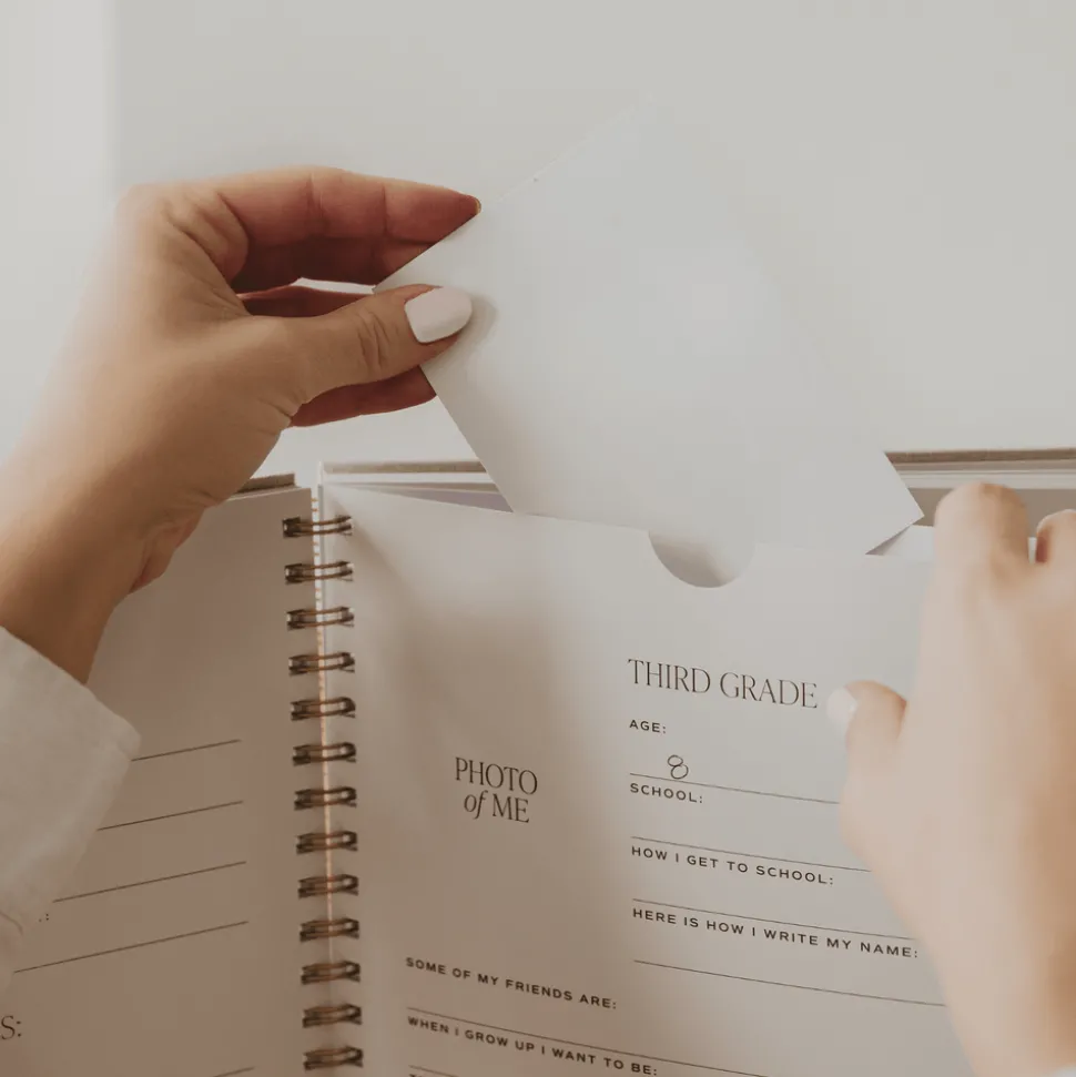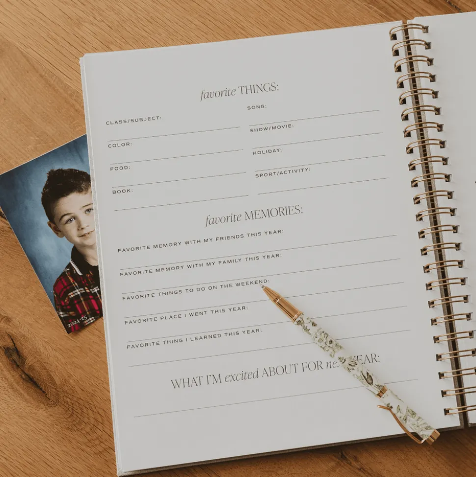 This thoughtful journal contains thick envelopes from preschool to 12th grade to hold all your child’s keepsakes and guided prompts to record the uniqueness you want to remember. From what they want to be when they grow up to their signature, a list of their favorites, extracurricular activities, friendships, and the year’s highlights, all contained in this modern hardback spiral journal keepsake.