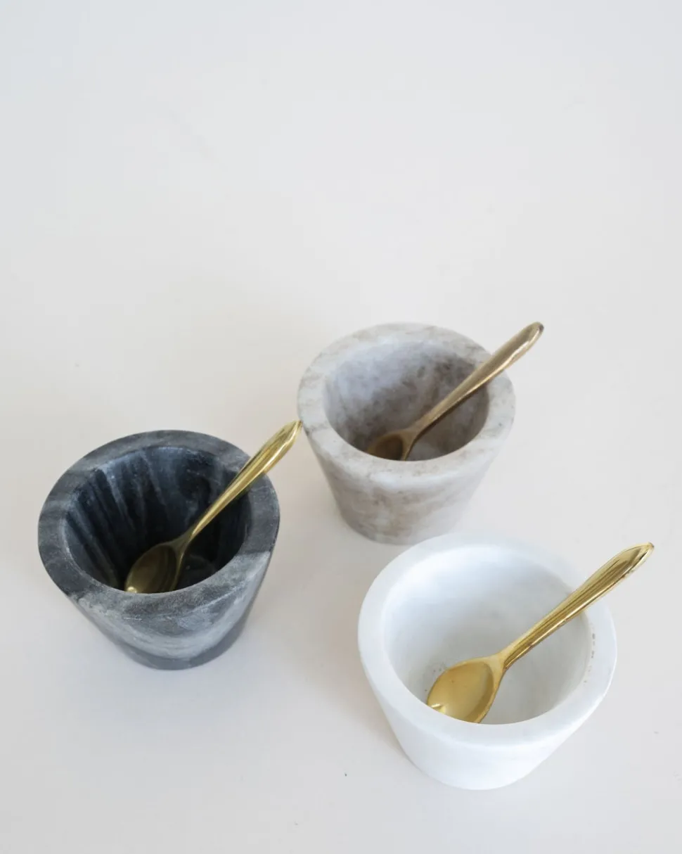 Marble Charcuterie Bowl set. 3″ Round x 2″H Marble Bowl w/ Brass Spoon, 3 Colors. Includes 3 bowls and 3 brass spoons.
