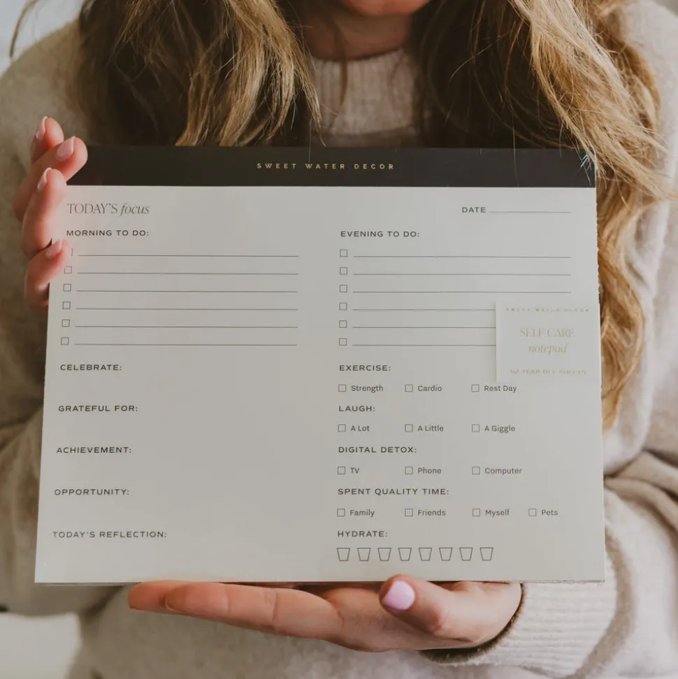 Prioritize your well-being while staying productive with our Self Care Notepad, a beautiful and practical desk accessory for work or home. Designed to help you stay organized while making space for what matters most, this daily notepad includes sections to track your hydration, exercise, digital detox, and reflections.