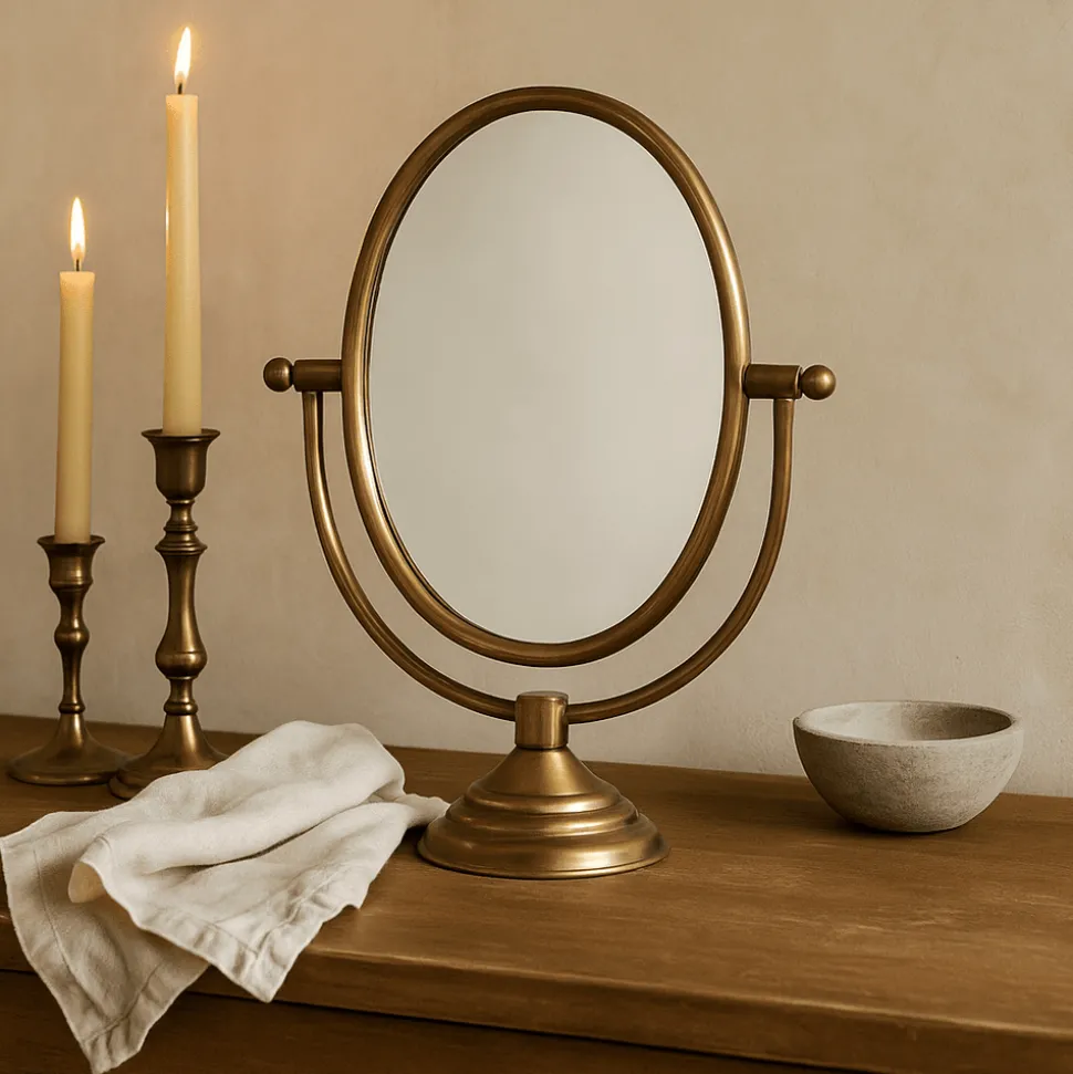 Bring timeless elegance to your vanity or console with this aluminum framed mirror on a stand, finished in a warm antique brass. The oval mirror sits atop a sculptural base with subtle detailing, blending classic design with modern utility. Perfect for a bedroom, bathroom, or entryway vignette, this mirror doubles as both a functional piece and a decorative accent. Its compact size makes it easy to style on dressers, side tables, or shelves, adding character and refinement to any space.
