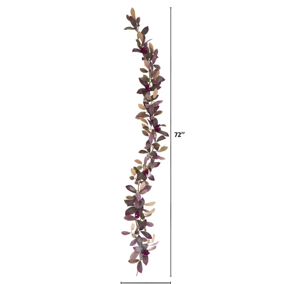 Accent your favorite spaces within the home with the help of this artificial garland boasting a collection of fall-inspired laurel leaves in subtle tones of green and purple. Great for both holiday decor, this 6’ long silk garland can be displayed all season long without fear of wilt or discolor.