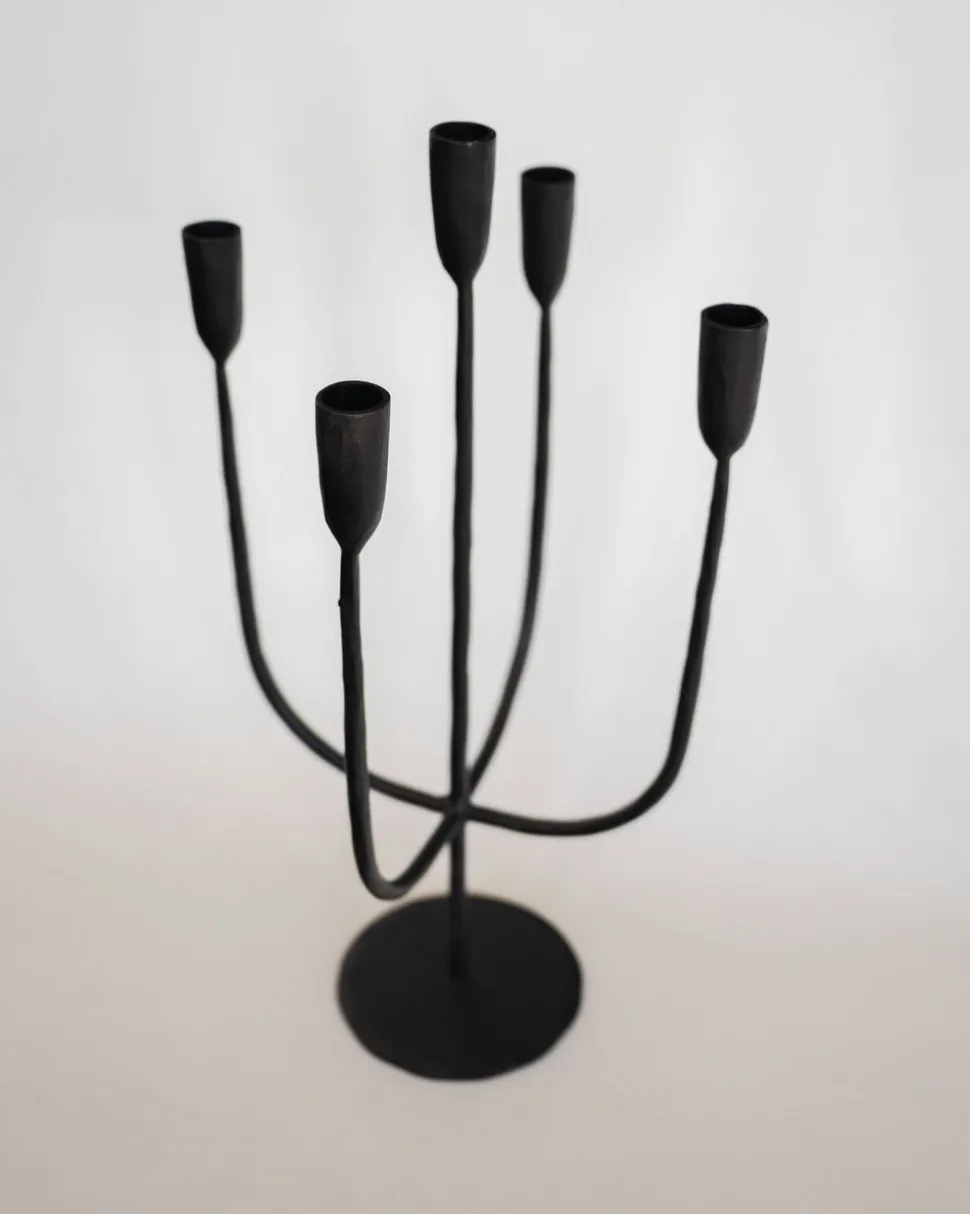Add some flair and elegance to the space with this black metal hand-forged candelabra. It is made of durable metal with a hand-forged texture that showcases meticulous attention to detail and the unique sculptural silhouette.