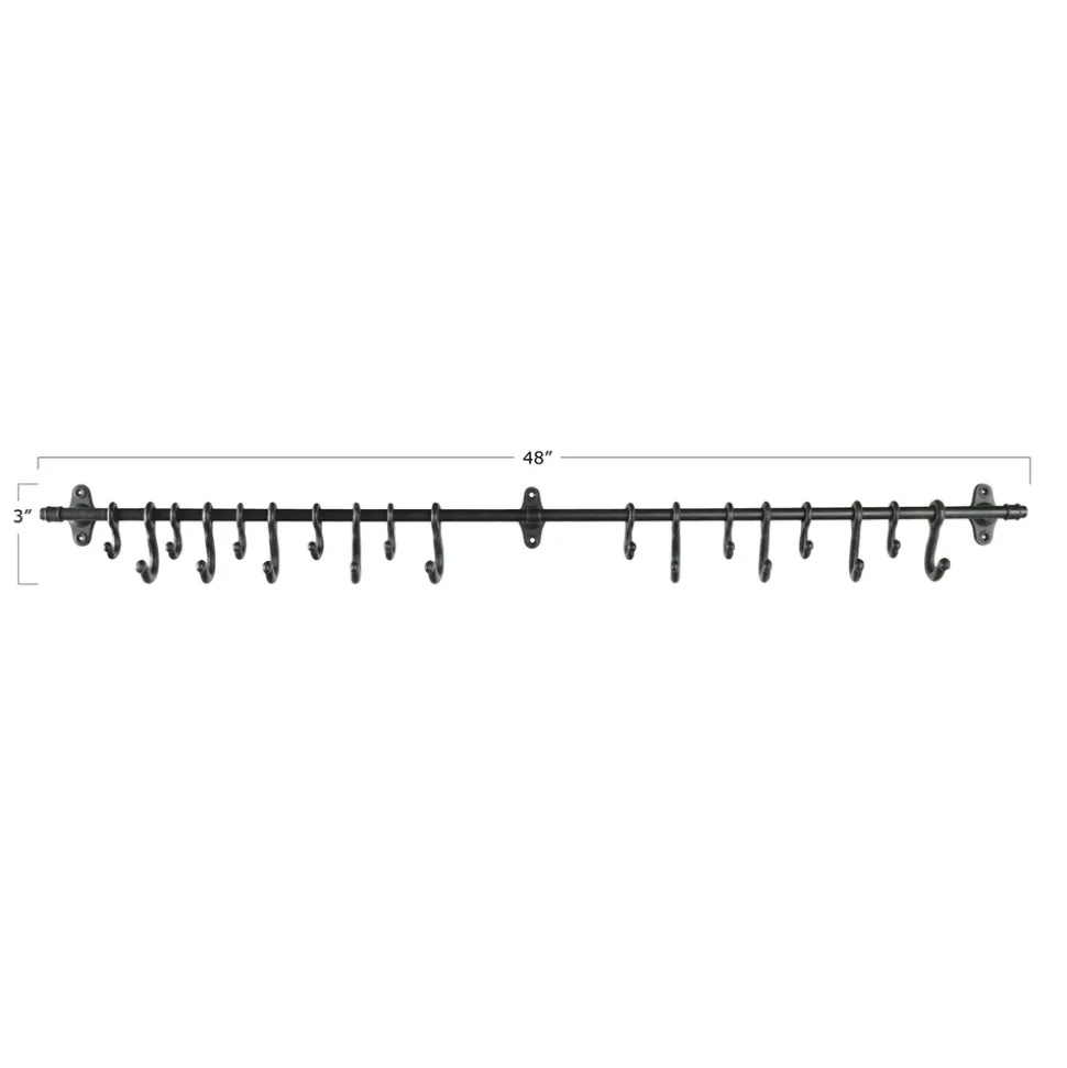 48″W x 4-1/4″D x 3″H Cast Metal Wall Rod w/ 18 Hooks, Black