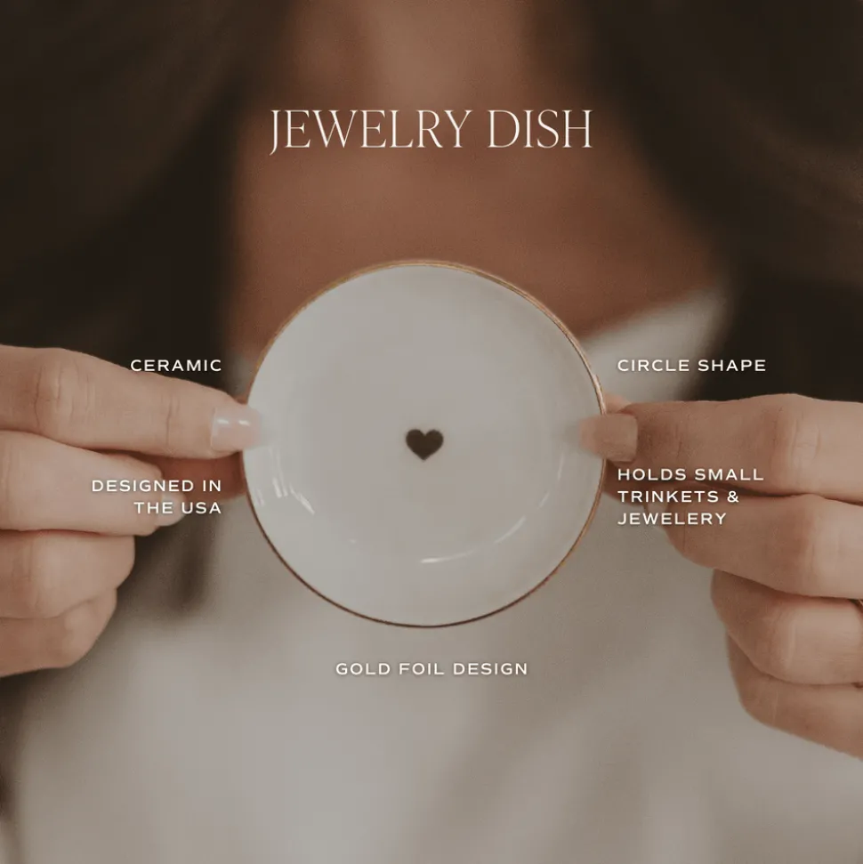 Keep your jewelry and small treasures beautifully displayed with our Gold Heart Trinket Tray. This ceramic catch all tray features a simple, chic gold foil heart design, making it the perfect ring dish for your dresser, vanity, or nightstand. With its clean and classic look, this small trinket dish is ideal for storing rings, earrings, and other delicate pieces – a thoughtful addition to any room and a sweet, practical gift.