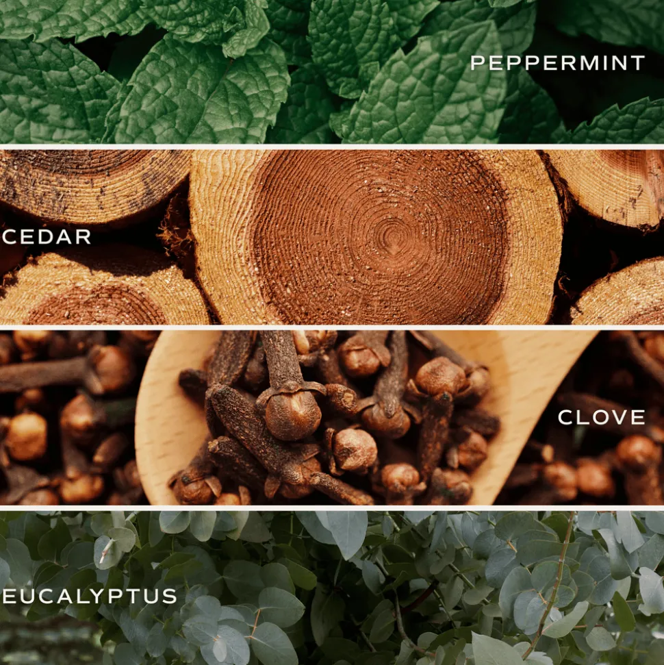 Infused with natural essential oils: eucalyptus oil, cornmint oil, cedarwood oil, patchouli oil