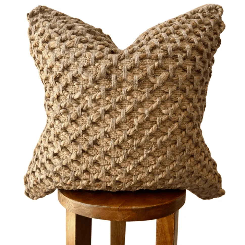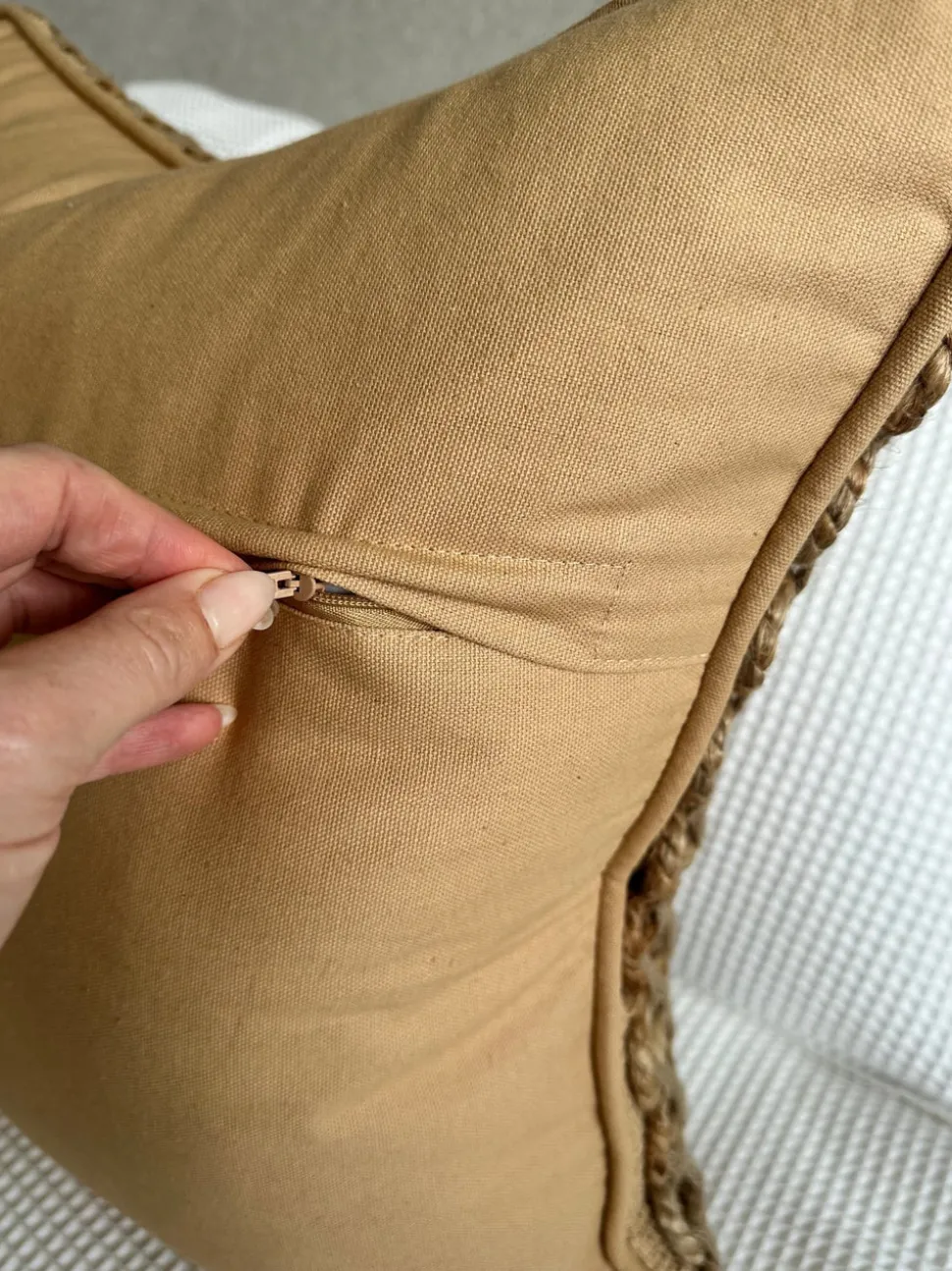 Elevate your space with natural textures and effortless style. Our Braided Jute Boho Chic Pillow Cover features a beautiful blend of earthy tan jute braided over soft tan woven cotton for a tone-on-tone look that complements any décor. Crafted with 80% woven cotton and 20% jute, this 20″ cover offers durability and cozy charm in one. The hidden zipper ensures a sleek, seamless finish, while the hand-washable fabric keeps it looking fresh. Perfect for layering on your sofa, bed, or favorite chair for that relaxed, boho-inspired vibe.